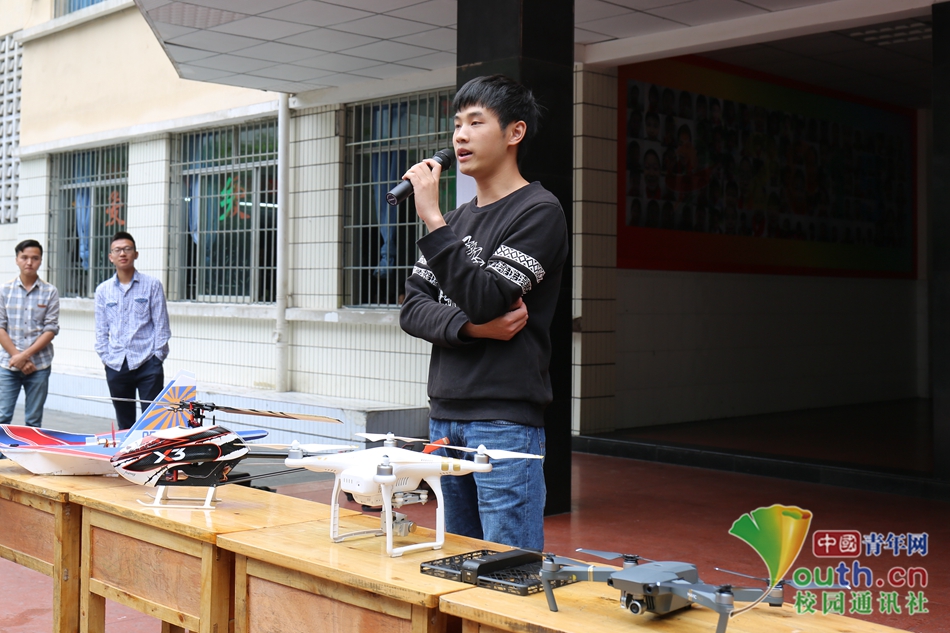 重庆大学城市科技学院无人机协会的同学正在为小朋友们介绍无人机的有关知识,或许是第一次当众进行讲解,他表现得有一点拘谨,但他还是认真的为大家讲述着他所了解的无人机。中国青年网通讯员 朱睿 摄