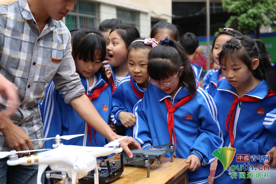 小朋友们围在桌边观察无人机协会的同学展示出来的不同种类和样式的无人机,他们的目光中带着一丝惊奇,仿佛在想小小的螺旋桨要怎么带动这块铁疙瘩飞起来。中国青年网通讯员 朱睿 摄