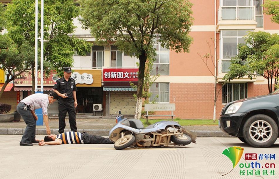 第二个演练科目:校园交通事故的应急处置。学生在驾驶电动车途中使用手机,不慎发生交通事故。中国青年网通讯员 张琳 摄