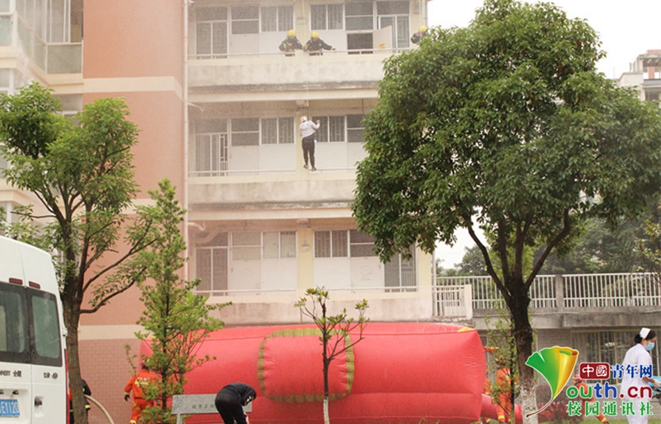 第三个演练科目:火灾突发事故的应急处置。消防员进入火场救出被困学生。中国青年网通讯员 张琳 摄