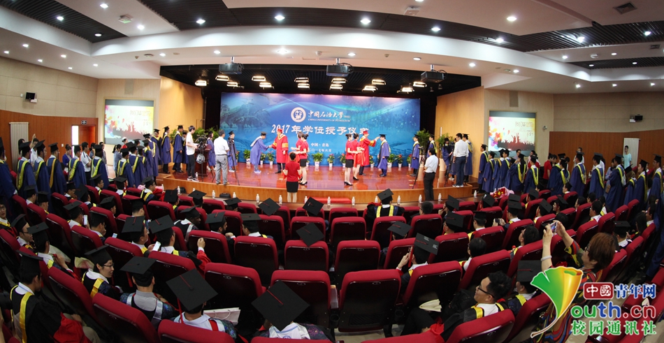 学位授予仪式现场,毕业生正排队走到台前,中国科学院院士、中国石油大学(华东)校长郝芳正在为毕业生授予学位。中国青年网通讯员 刘积舜 摄