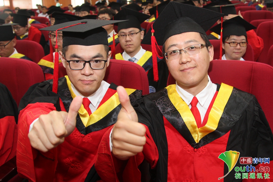 “今天,我们都是最棒的!”学位授予现场,获得博士学位的毕业生朝镜头比大拇指,庆祝他们顺利毕业。中国青年网通讯员 刘积舜 摄