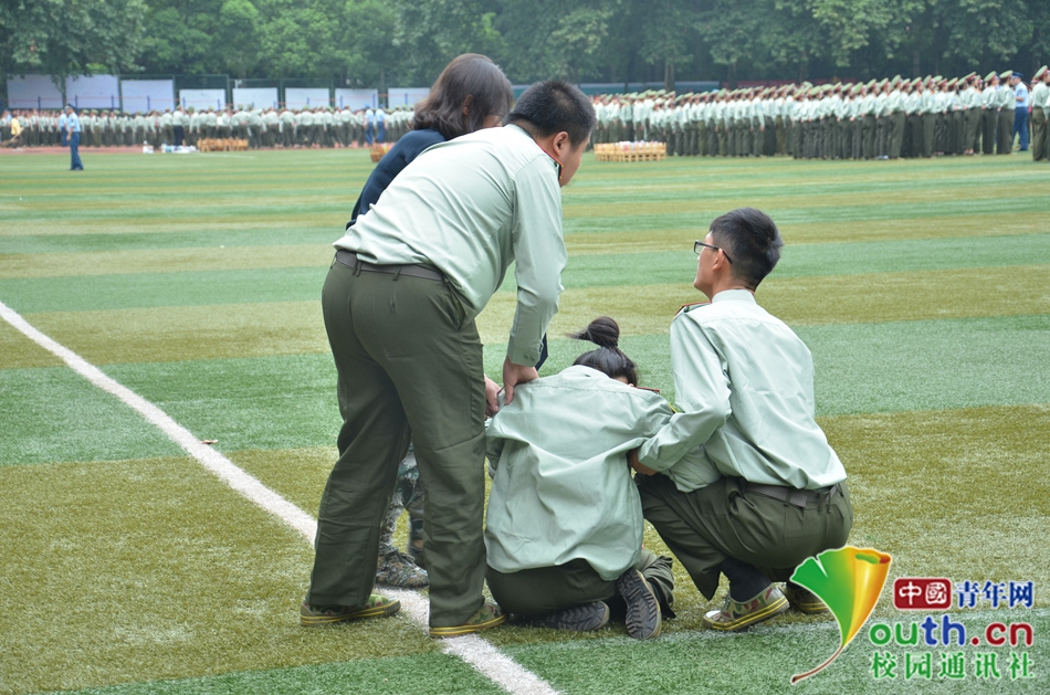 有新生因军训身体不舒服,老师和同学纷纷上前帮忙。中国青年网通讯员 张诗琪 摄
