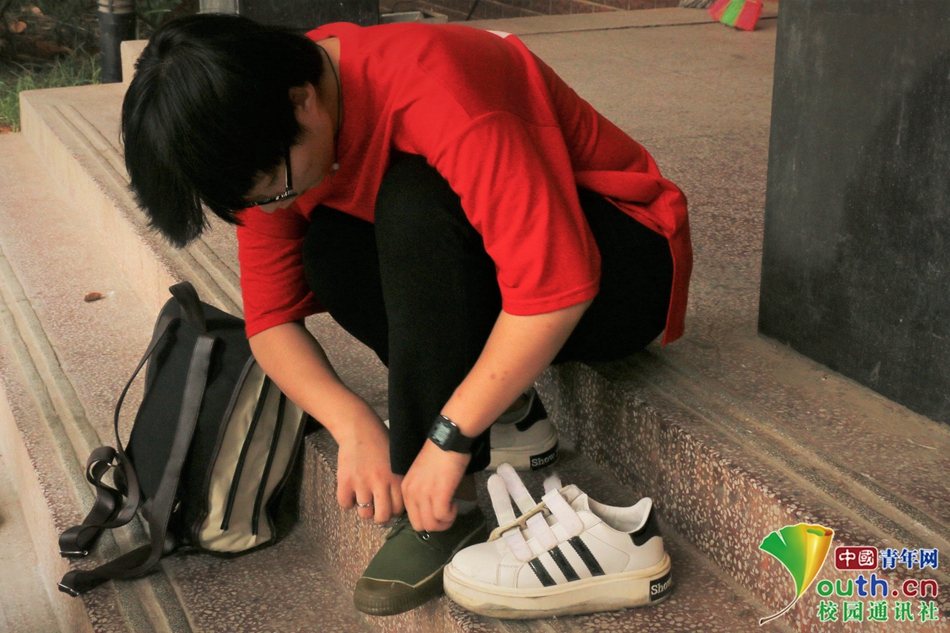 刚拿到军训服,就迫不及待在楼梯上试穿起来。中国青年网通讯员 潘慧红 摄