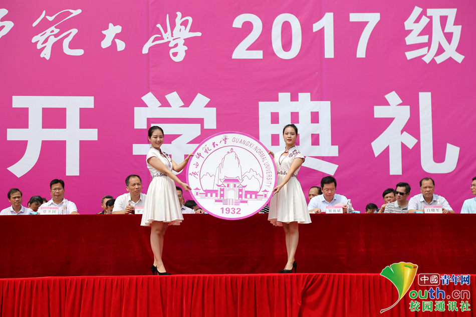 典礼期间,学生代表对校徽、校训进行了展示解说。广西师范大学校标是双圆套圆形徽标,中间是由独秀峰和王城校区正门组成的图案,图案上方套内圆环,下方有“1932”字样,代表学校建校时间;外环左上方是由著名书法家、我校教授伍纯道题写的“广西师范大学”,外环右上方是“GUANGXI NORMAL UNIVERSITY”大写英文。中国青年网通讯员 张琳 摄