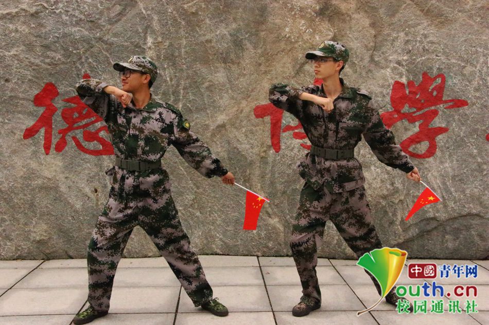 周口师范学院校训前,大一新生手持国旗摆出昂扬向上的姿势,祝福祖国越来越强大。中国青年网通讯员 秦紫玲 提供