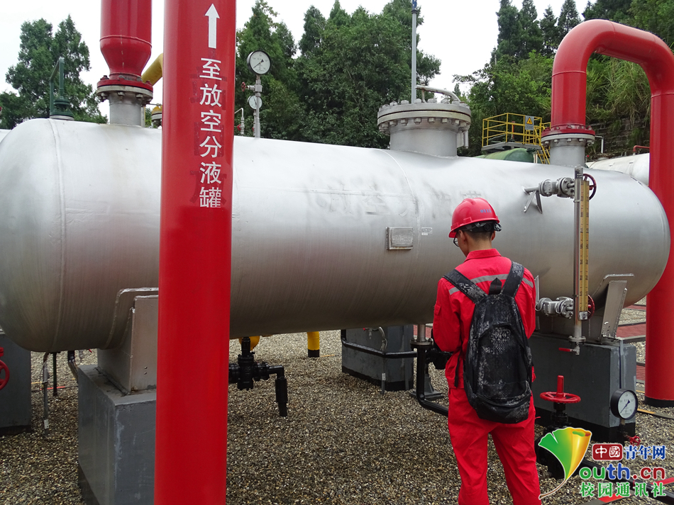 现场参观实习中,同学们直观接触到很多工艺设施,这是在平时课堂和书本中所了解不到的。图为实习队员在自主学习参观放空分液罐,掌握其工作原理。中国青年网通讯员 杨磊 提供