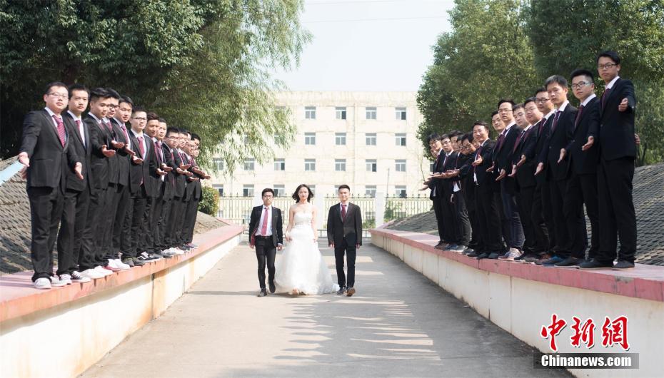 唯一的女生化身“新娘”,35名“保镖”护驾。 钟欣 摄