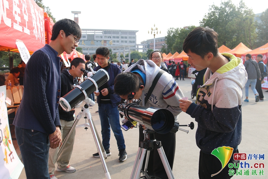 爱好天文的同学正在使用天文社的探测仪感受天空的浩瀚无穷。中国青年网通讯员 赵梓维 摄
