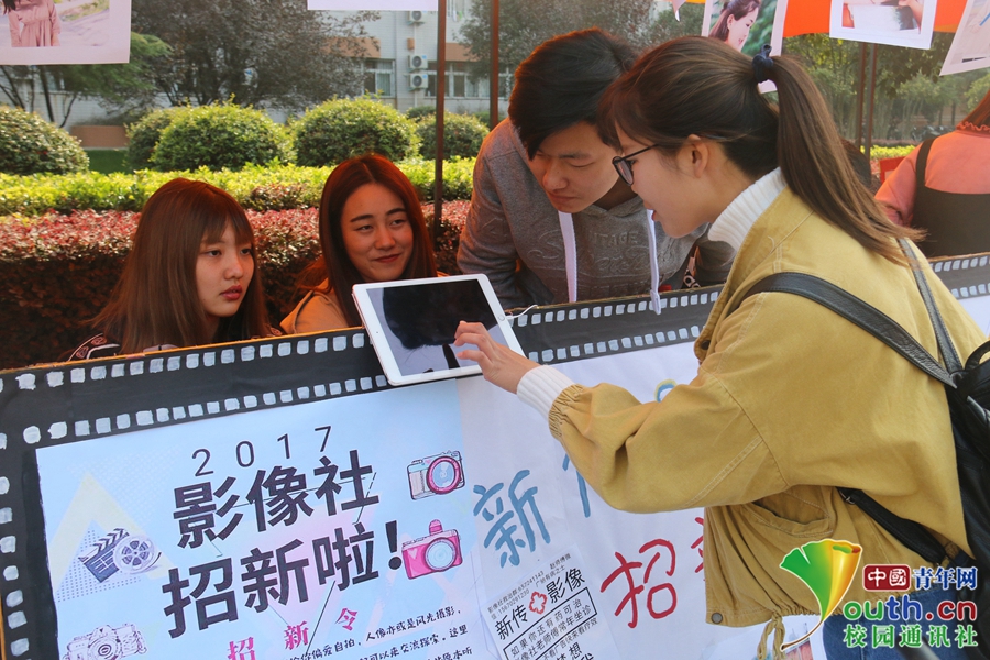 影像社团成员在热情耐心地给同学们介绍着自己的社团作品,以此激发同学们对于摄影兴趣。中国青年网通讯员 张雅荣 摄