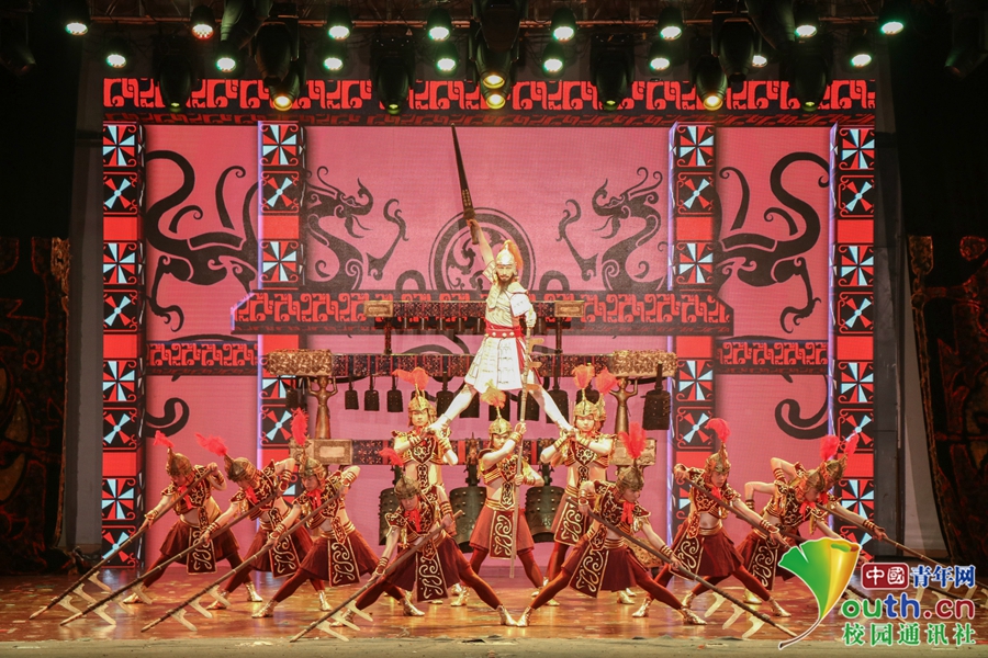 表演不仅有美妙的奏乐,也包括高难度的精彩舞蹈。在大气磅礴的钟鼓和鸣声中,演员们目光如炬,迸发古代将士的豪情,为观众们呈现不同凡响的《演兵》。中国青年网通讯员 张洪涛 摄