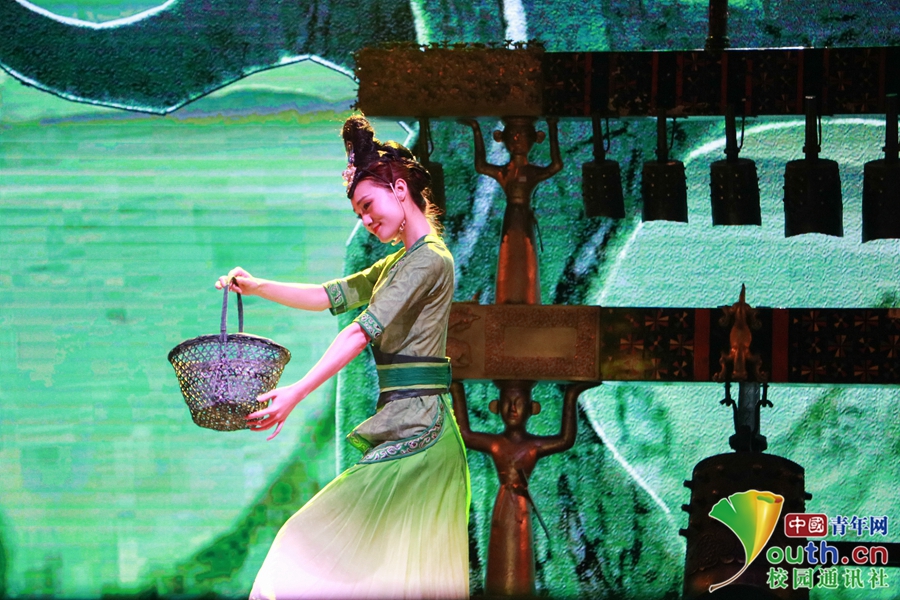 《采桑》以悠扬婉转的曲调诉说着少女的心事,曼曼舞步,步步生莲,展现荆楚女子的恬静美好。中国青年网通讯员 李慧莹 摄