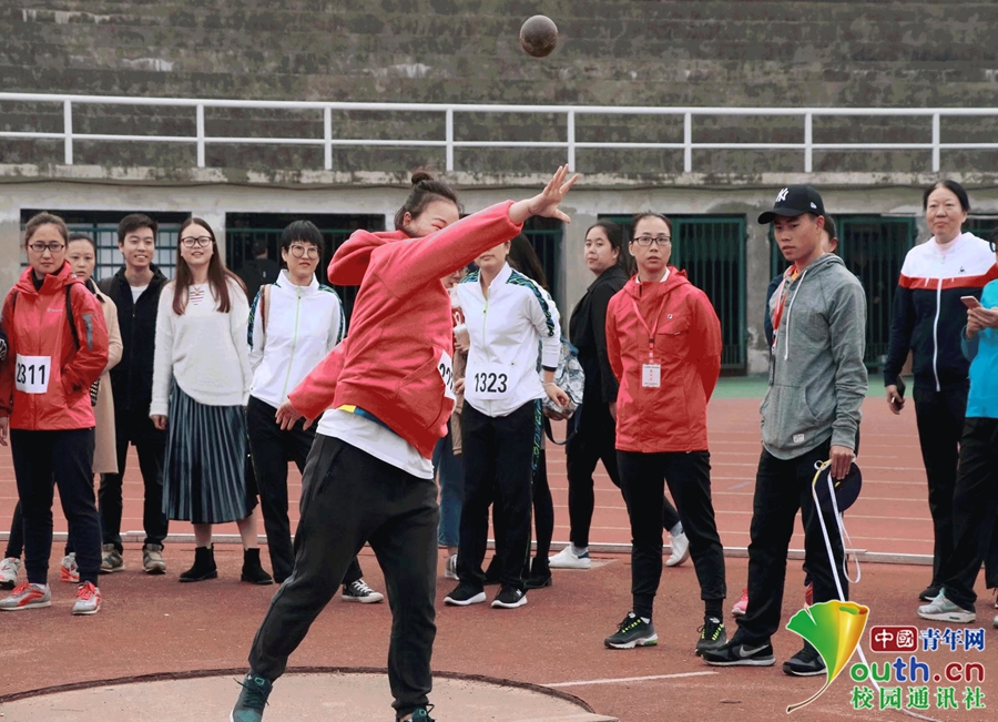 教师代表的在扔铅球上大放异彩。中国青年网通讯员 李灵芝 提供