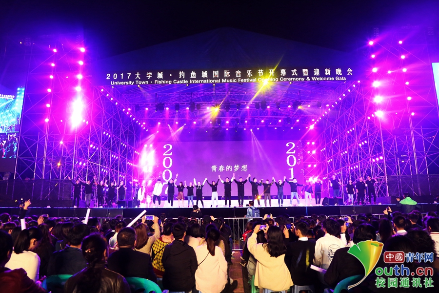 《最美的季节》给最美的我们。这是教职工老师们的演唱。艺术教育中心全体教师和四位老师的真情演绎。热血与激情的演唱也瞬间点燃了在场的观众人们仿佛融入了老师们的歌声里。台下的同学手里挥舞的荧光棒,和台上随着音乐律动的彩光灯,交相辉映,精彩纷呈。中国青年网通讯员 何佳星 摄