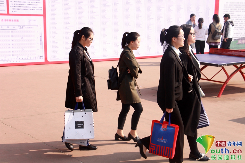 02 几位穿着正装的应聘者向会场走去,褪去往日在校园的青涩,她们体现的更多的是一种稳重与成熟。 中国青年网通讯员 刘润 摄