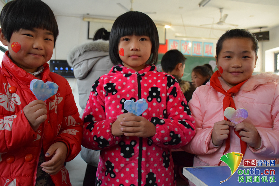 在手工制作的课堂上,青年志愿者们耐心地教三年级的孩子们折纸,图中显示为三个孩子将折纸爱心作品展示给志愿者老师。中国青年网通讯员 李城杭 摄
