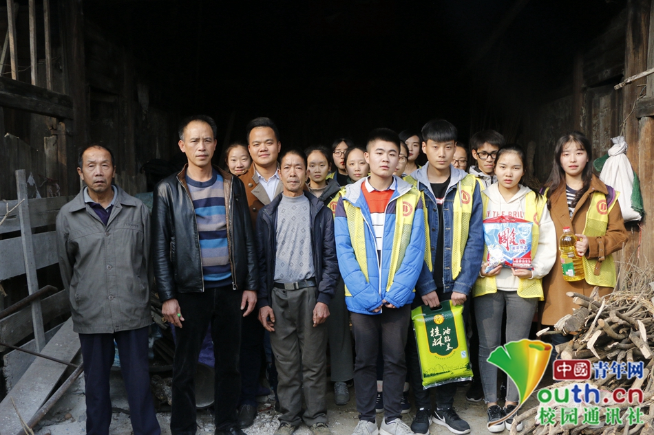志愿者为低保村民发送物资后,在低保村民家中合影留念。中国青年网通讯员 杜艳涛 摄