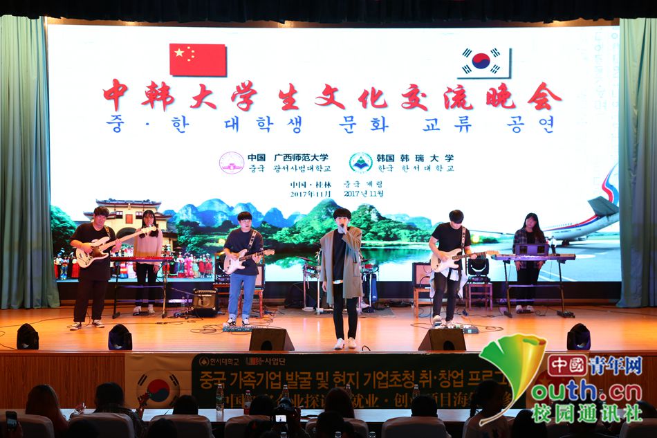 韩瑞大学实用音乐系学生带来的歌曲串烧掀起了全场气氛的高潮。他们不仅倾情演奏了中国流行歌曲《你的爱》《存在》《朋友》,还演唱了韩国和外国等多首流行歌曲,现场掌声雷动,欢呼声不绝于耳。中国青年网通讯员 张琳 摄