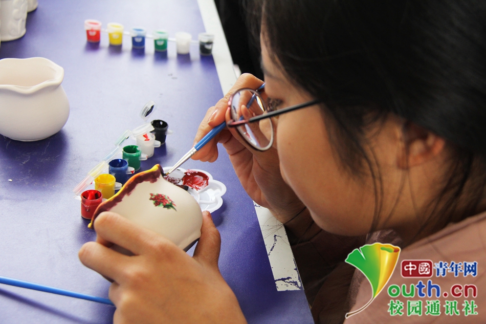 浦江学子坐在凳子上认真DIY小陶罐,为公益献出自己的爱心。中国青年网通讯员 陆媛