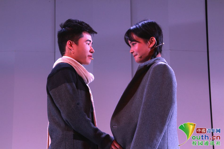 汉语言文学二班带来的话剧《暗恋》上演了一段凄美动人的爱情故事。上海作别,命运的捉弄,浊世半生方才见到孤光残影的对方。独特的戏剧结构,悲喜参半,带给观众起落分明的感受。图为主人公甜蜜告白。中国青年网通讯员 梁佩芳 摄