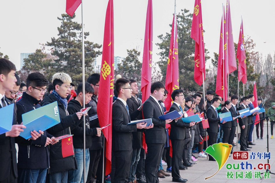 石大学子集体宣誓:“从现在开始,用自己的行动,在祖国的美好大地上描绘一幅青春无悔的画卷!”表达自己爱国报国的一腔热血。中国青年网通讯员 卢丽雯 摄