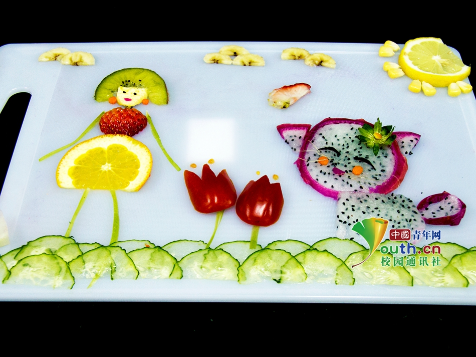 新鲜的水果女孩和扑蝶的小猫咪正在享受午后悠闲时光。香蕉云朵和柠檬玉米小太阳都是学生的创意之作。 中国青年网通讯员 张婧 摄