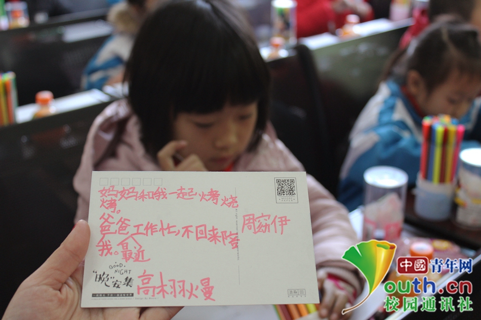 在“稚心信笺”活动中,六岁的小伊向志愿者分享了她的明信片,自己却低下了头紧紧盯着桌面。生活中每天会发生那么多的事,但是她心中最开心的事,却一直是很久前和妈妈的烧烤,最悲伤的是父亲的繁忙不归家。中国青年网通讯员 杨雪情 摄