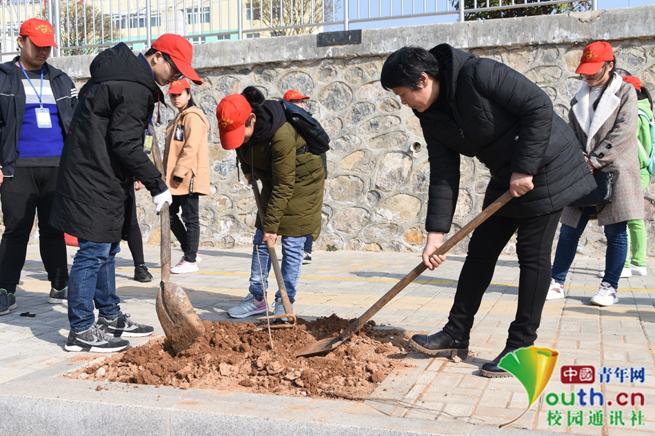 淮北市相山区东街道机场小区周主任和志愿者们一同种树,给同学们讲述着自己年轻时也同志愿者们一样种下小树,种下的小树最后长成大树,供人乘凉。并鼓励着志愿者们多参加这种活动。中国青年网通讯员 祁卫红 摄