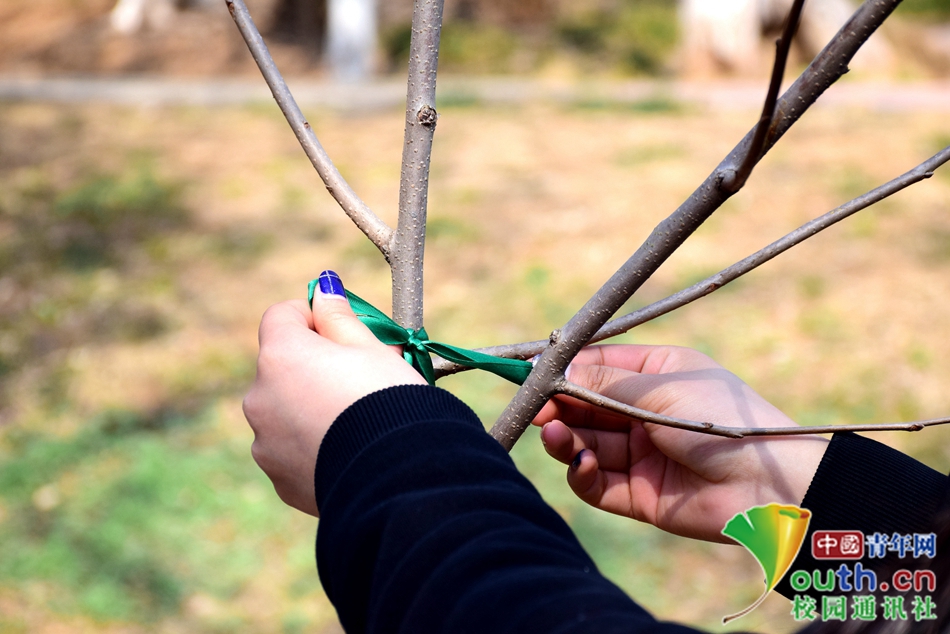 志愿者为自己种下的树系上了漂亮的蝴蝶结,希望以后自己能看看自己种下的树。中国青年网通讯员 冯丽璇 摄