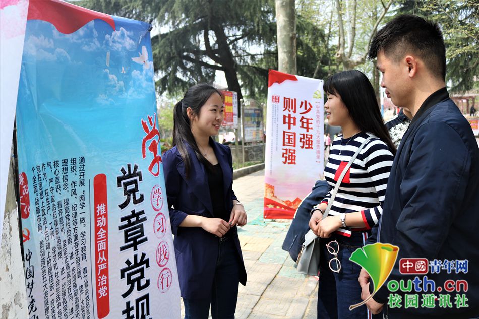 数学科学学院学子在宣传海报前向一名存在疑惑的同学解释践行学习两会相关精神内容的场景。中国青年网通讯员 钱程 摄