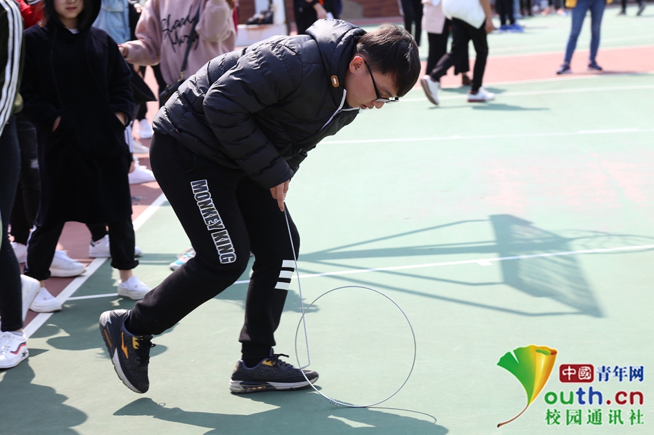 “滚铁环”是一项传统的民族体育运动项目。参赛者手捏"U"字形铁丝,推着一个圆形铁环向前跑,铁环上套着两三个小环,滚动时发出铃铛般声响。在滚铁环比赛中,需要人环合一,人可以控制环平衡,同时也要跟随圆环滚动的速度,这是一场速度与激情的竞技。中国青年网通讯员 黄绿茵 摄