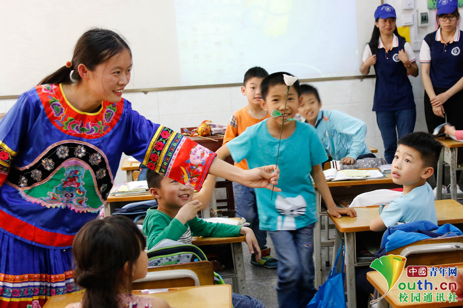 在做变色实验时,小朋友们满怀好奇的看着花朵的颜色变化。中国青年网通讯员 陆悦文 摄
