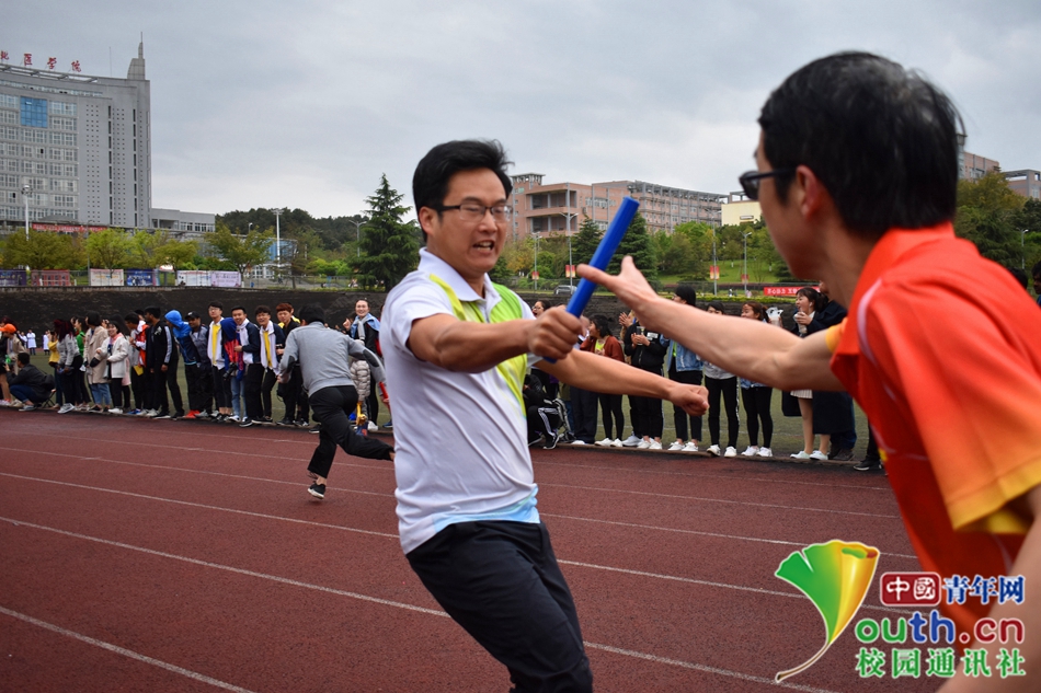在运动场上,接力棒从来就是代表着团结与信任。图为老师们在参加接力比赛时交接的画面。 中国青年网通讯员 刘润 摄