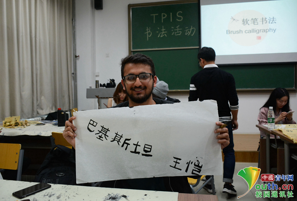 留学生王恺自豪地展示自己的作品,宣纸上面是祖国母亲。中国青年网通讯员 王珺玥 摄