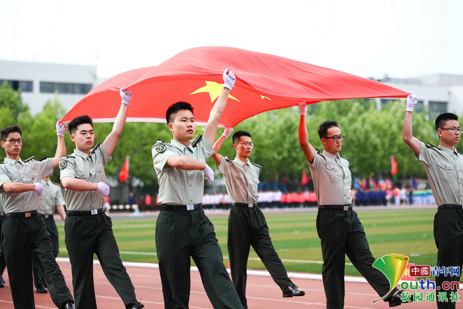 “一二一、一二一”有力的嗓音、整齐的步伐、统一的着装、严肃的表情,护旗手们举着国旗走在方队的最前方,为方队开路,为国旗“护航”。中国青年网通讯员 王雨欣 摄