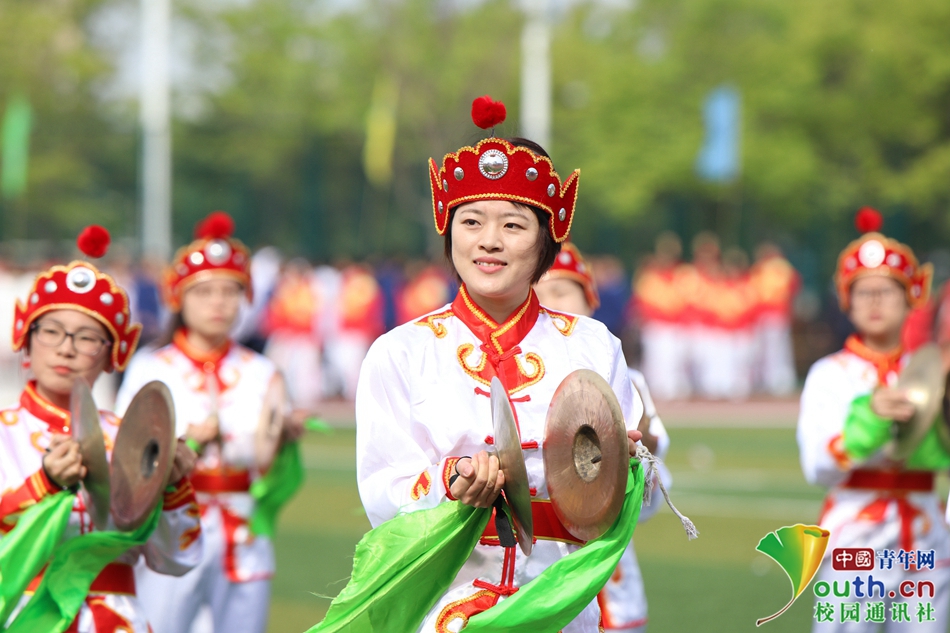 锣鼓齐鸣,手中握着锣的方队成员随着鼓点有节奏的击打,共同营造出一场夺人眼球的表演。中国青年网通讯员 卢赟 摄