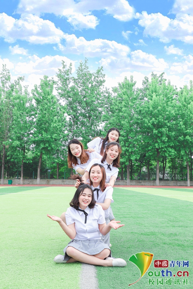 该校风雨操场上: 2014级外语系和经管系的318混合宿舍的室友排成一列,每个人的脸上都洋溢着开心的笑容。 中国青年网通讯员 汤蕾 摄