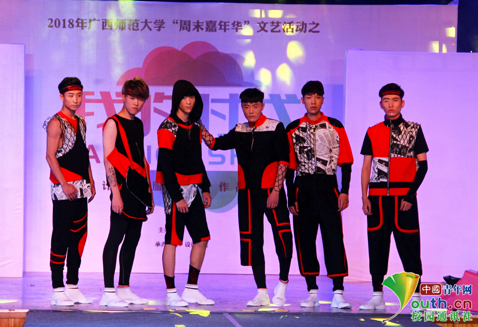 冷峻的表情,帅气的动作,《聚焦》这一组服装正巧映衬了它的主题,吸引了全场大部分的关注,黑色搭配亮眼的橘色形成了强烈的视觉冲击力,带领着服装展开始走向高潮。中国青年网通讯员 任昱颖 摄