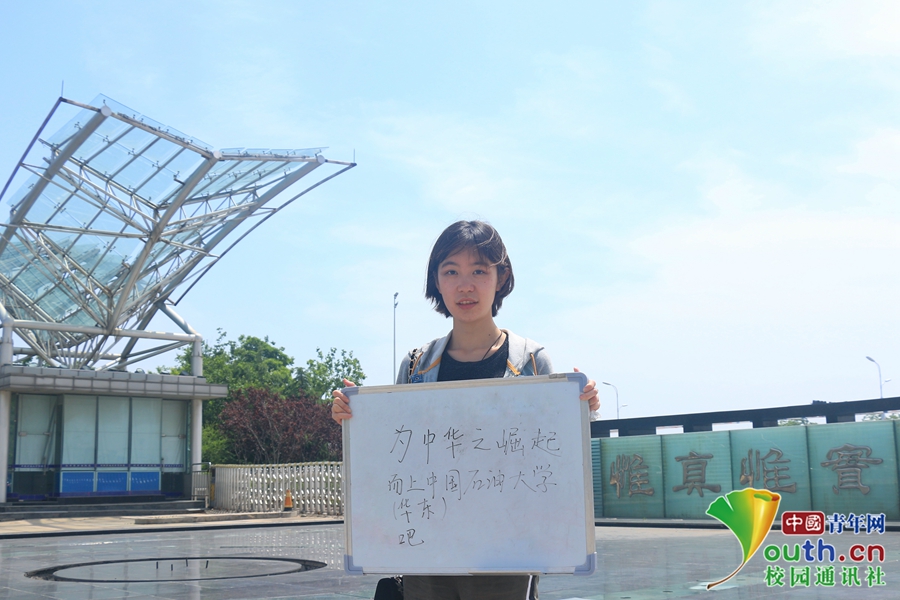 “为中华之崛起而上中国石油大学(华东)吧!”话语虽然俏皮,但是却充满了石大学子对即将面临高考的学弟学妹们的深切关心与期盼。中国青年网通讯员 王秋月 摄