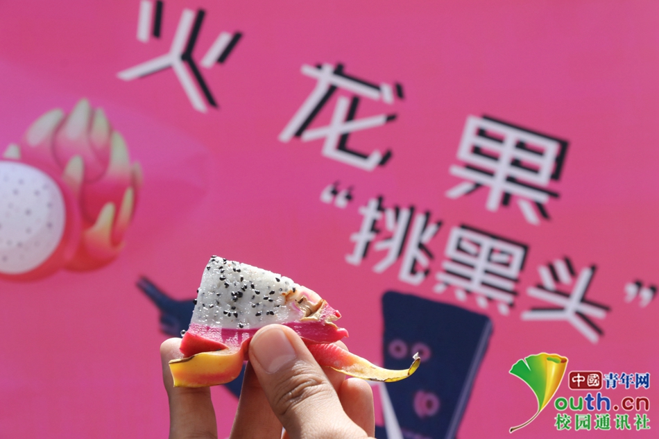 挑火龙果籽,每个同学获得一块火龙果,“黑头”必须完全挑干净,谁先剔完谁获胜,否则成绩作废。选手用牙签挑干净后,可以免费品尝。中国青年网通讯员 马双强 提供