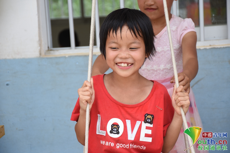 力学秋千,整个受力点落在一本书上,小朋友坐上特别的秋千笑容无比甜美。 中国青年网通讯员 梁慧 摄