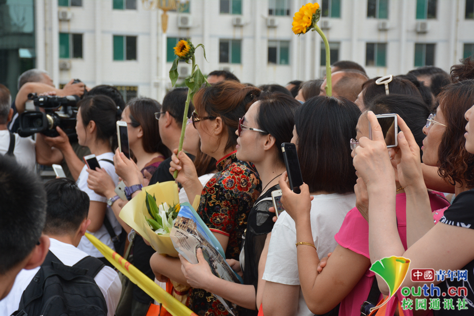 怀抱鲜花,目光凝视考场,家长们在场外等待孩子们的凯旋。中国青年网通讯员 马政帅 摄