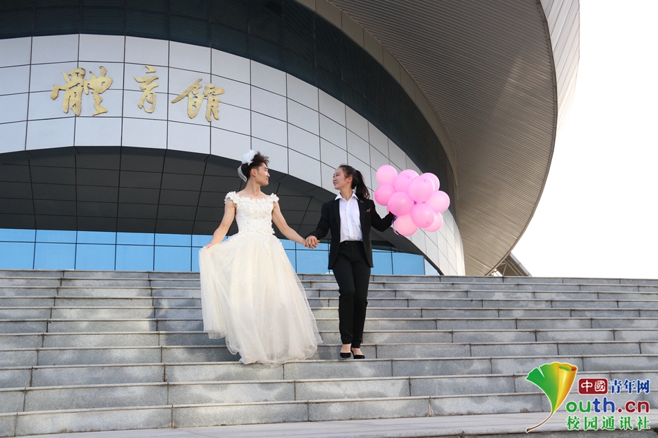 高校大学生拍反串婚纱毕业照 男生穿婚纱“嫁”给女生