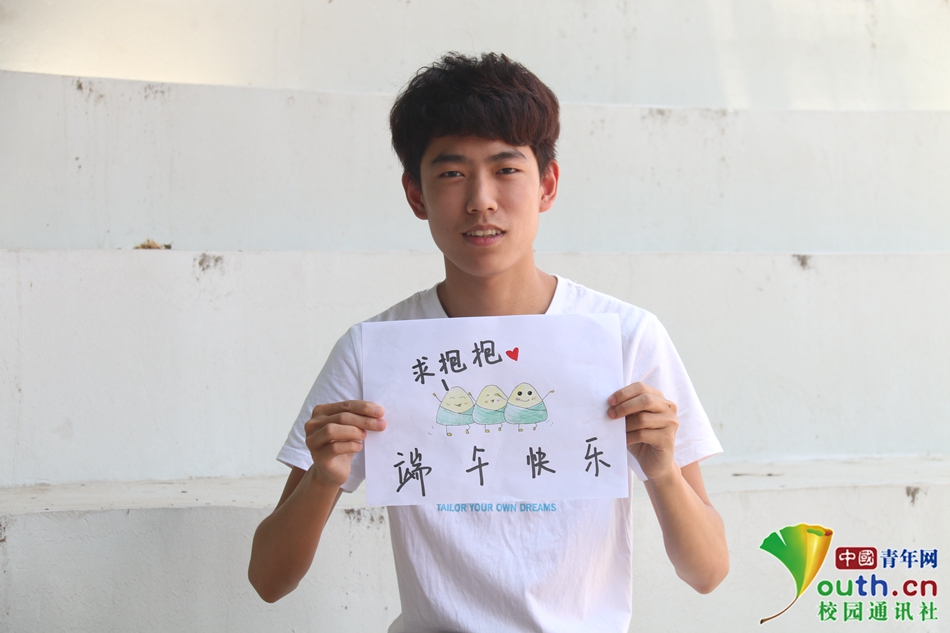 一学生拿着写有“端午快乐,求抱抱”字样的纸张,送出自己对身边同学的祝福 中国青年网通讯员 张浩荣 摄