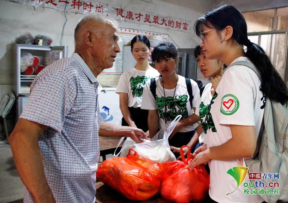 大米、香蕉、苹果……志愿者们为老人送去慰问的物资,老人抓起一把大米,讲述起自己年轻时的艰苦岁月和这些年来生活条件的变化,告诉志愿者们要珍惜当下美好时光。中国青年网通讯员 甘泉 摄