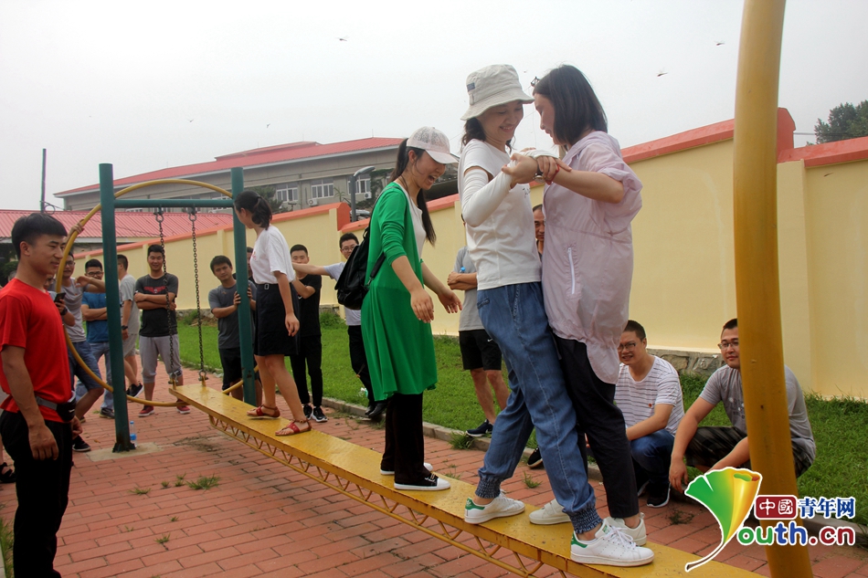 图为学员进行素质拓展“狭路相逢”项目。中国青年网记者 崔宁宁 摄