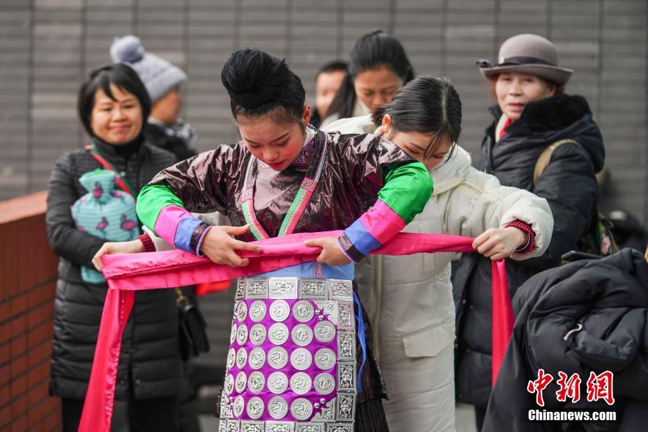 1月4日,贵州大学考点,一名侗族考生在考场外穿本民族服饰。当日,贵阳市温度2℃-6℃,贵州省2019年普通高等学校招生艺术类专业考试在贵州大学举行。中新社记者 贺俊怡 摄