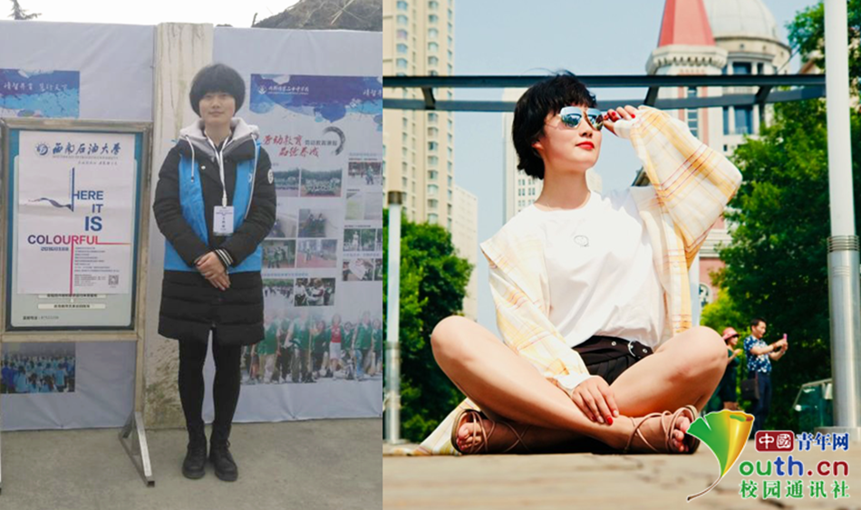 西南石油大学邹冰雪大一大四对比照。她说:老照片是我大二寒假回到高中母校去做志愿者分享,在宣传栏前的拍照留念。新照片是在天津,我专业组织的暑期实习,是在天津的步行街外面的桥上,海风很舒服,阳光也很好,就着自带滤镜的背景拍的照片。本人供图