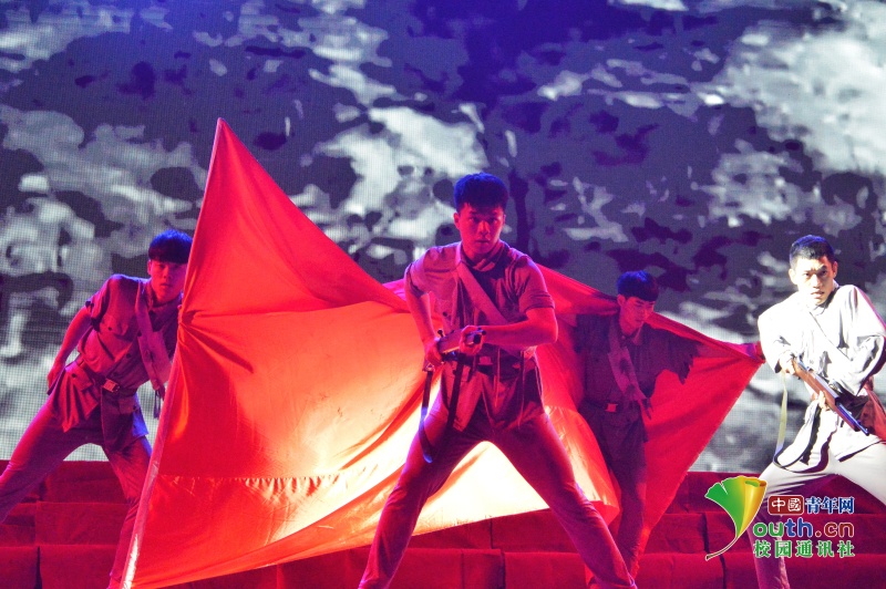 红旗的起落象征了中国抗战史的波澜起伏。最令观众感慨的是战士跌跌撞撞,用布满伤痕的手坚定的举起了红旗。中国青年网通讯员 朱嘉仪 摄