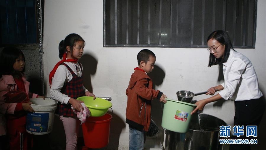 夜晚,方荣给罗田县希望小学住校学生打水洗漱(10月10日摄)。新华社记者 姚琪琳 摄